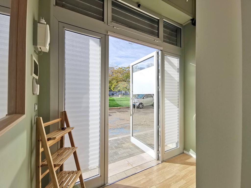 La vetrina d’ingresso in anticorodal con vetro antisfondamento offre ottima visibilità e sicurezza, mentre le porte interne in legno – scorrevoli nei due ambienti e a battente nel bagno – aggiungono funzionalità e un tocco di qualità.